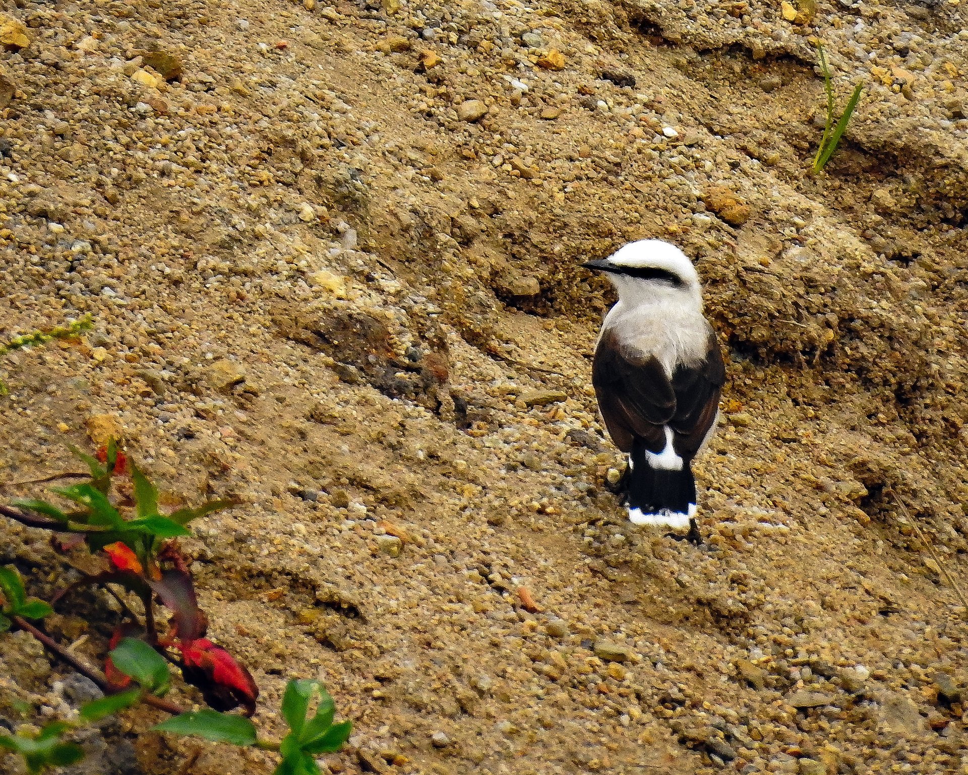 Sua coloração é principalmente branca contrastando com uma estreita faixa transocular preta que termina em uma leve curvatura para baixo logo após a região auricular. A testa, coroa e nuca são brancas. O manto apresenta coloração clara levemente castanho-acinzentado. As asas apresentam coloração escura com tons castanho-acinzentados mais escuros que o manto. O uropígio e as penas supracaudais são brancas. A cauda é preta e apresenta a porção distal com manchas brancas. A garganta, peito, ventre, crisso e infracaudais são brancos.